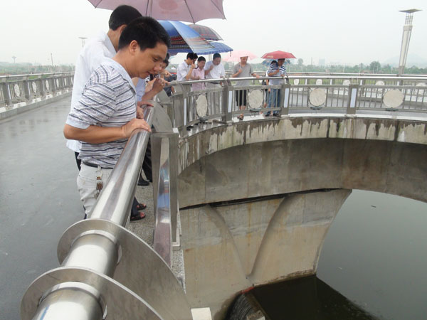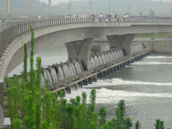 三級(jí)抬水壩與人行景觀橋下游面全景